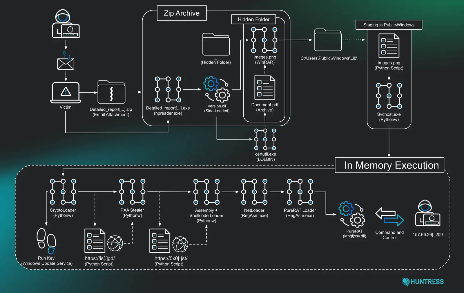 Исследование Huntress, которая на первый взгляд казалась стандартной атакой с использованием Python-стилера, приняло неожиданный оборот, когда выяснилось, что её конечной целью является развёртывание полнофункционального коммерческого трояна удалённого доступа PureRAT. Эта операция демонстрирует чёткую и продуманную эскалацию: начинается с простой фишинговой приманки и проходит через уровни загрузчиков, работающих в памяти, уклонения от защиты и кража учётных данных. Финальная полезная нагрузка, PureRAT, представляет собой модульный бэкдор, дающий злоумышленнику полный контроль над скомпрометированным хостом. Данный анализ раскрывает всю цепочку атаки, предоставляя контекст и индикаторы компрометации, необходимые для защиты сетей.