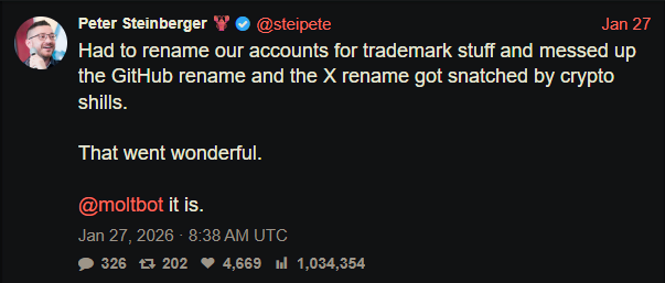 Инцидент начался с технической ошибки. Основатель проекта Питер Штайнбергер в процессе переименования ненадолго освободил названия организаций на GitHub и в социальной сети X, что позволило третьим лицам моментально их зарегистрировать. Как позже отметил разработчик в своём аккаунте, это привело к захвату аккаунтов сторонними лицами. Этот краткий промежуток стал отправной точкой для развёртывания скоординированной кампании по имитации.
