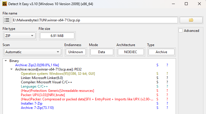 Изначальный файл, названный "winrar-x64-713scp.zip", при детальном анализе оказался сложной многоуровневой конструкцией. Первоначальная проверка утилитой Detect It Easy показала наличие нескольких слоев упаковки, включая 7-Zip, UPX и самораспаковывающийся архив. Распаковка файла привела к исполняемому файлу "winrar-x64-713scp.exe", который, в свою очередь, был запакован с помощью модифицированной версии UPX. Для его распаковки исследователям пришлось использовать принудительный режим из-за намеренно внесенных аномалий в структуру файла.
