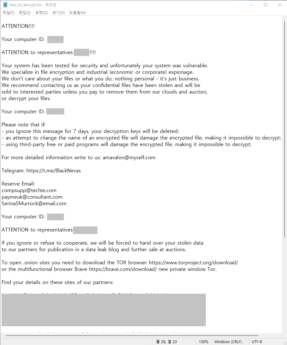 После завершения шифрования на рабочем столе и во всех доступных каталогах создается файл how_to_decrypt.txt. В нем злоумышленники представляются профессионалами в области шифрования и промышленного шпионажа, угрожая утечкой данных или их продажей с аукциона, если переговоры о расшифровке не будут начаты в течение 7 дней.