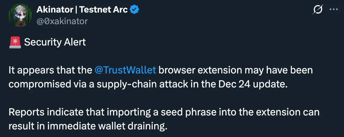 24 декабря 2025 года в Chrome Web Store была опубликована версия Trust Wallet 2.68.0. Уже через несколько часов после обновления пользователи начали сообщать о несанкционированном списании средств. 25 декабря известный исследователь блокчейна ZachXBT обнаружил и публично обозначил подозрительную активность в сети, а вскоре после этого специалист по безопасности под псевдонимом Akinator связал проблему именно с обновлением расширения. К 26 декабря команда Trust Wallet официально подтвердила факт компрометации. Сооснователь Binance Чанпэн Чжао (CZ) объявил, что все пострадавшие пользователи будут полностью возмещены за счет фонда SAFU. Скомпрометированная версия была удалена из магазина, а в качестве исправления выпущена версия 2.69. Пользователям рекомендовали перевести средства на новые кошельки.