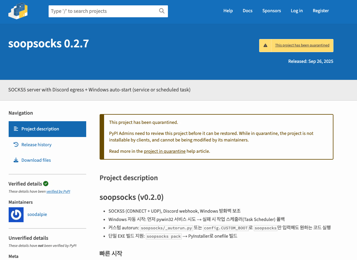 Исследователи безопасности из компании JFrog обнаружили и проанализировали подозрительный пакет soopsocks в репозитории PyPI, который маскируется под легитимный инструмент для создания SOCKS5-прокси, но демонстрирует поведение, характерное для бэкдора. Пакет был удален из репозитория 29 сентября после уведомления сопровождающих PyPI о подозрительной активности.