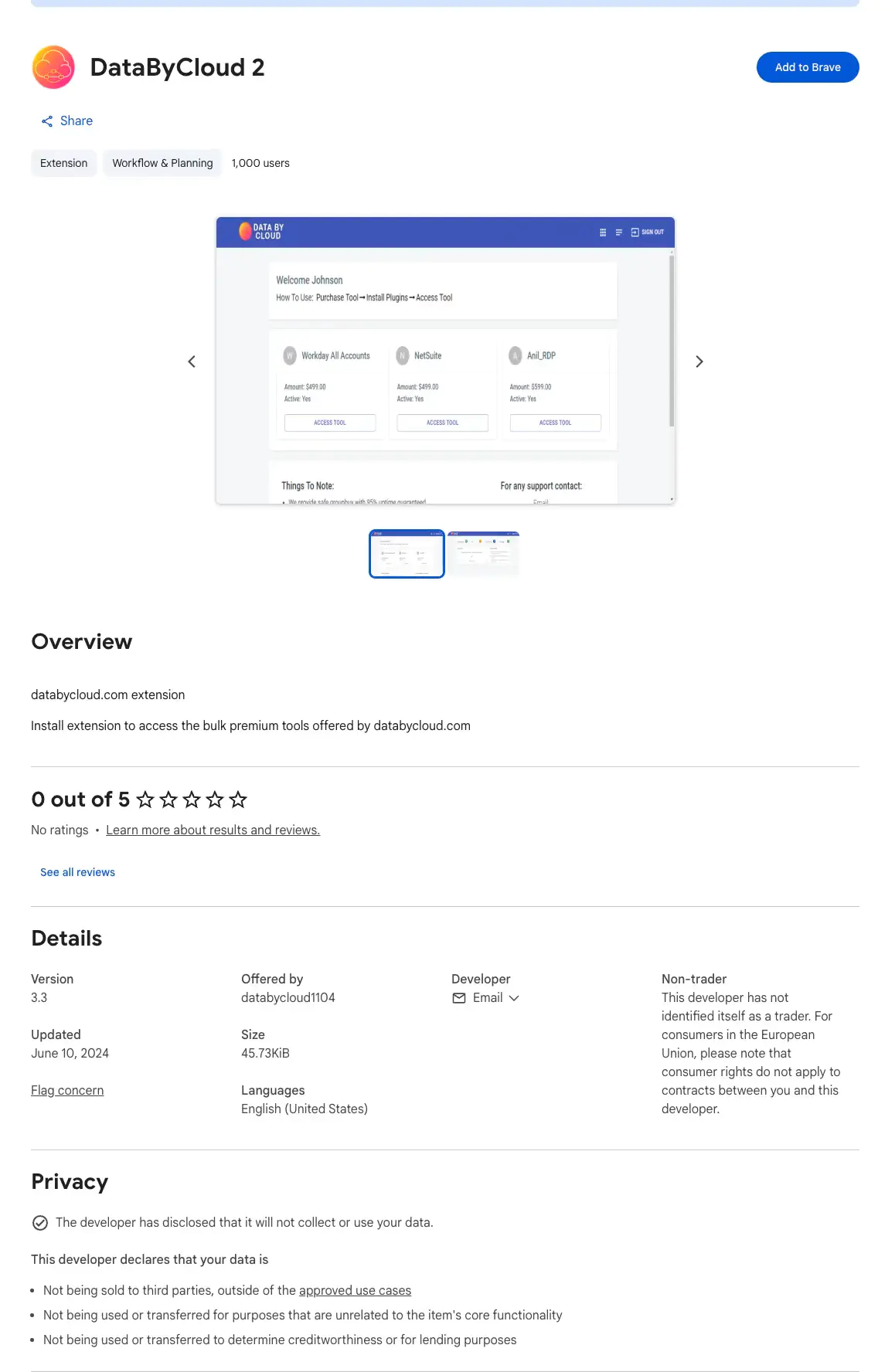 Расширения маскируются под легитимные инструменты повышения производительности. Они рекламируют себя как решения, упрощающие доступ к корпоративным платформам для пользователей, работающих с несколькими учетными записями. Например, DataByCloud 2 позиционируется как менеджер массовых инструментов с отполированной панелью управления. В свою очередь, Tool Access 11 заявляет, что помогает «ограничить доступ к специальным инструментам», представляясь средством безопасности. Однако анализ кода выявляет их истинную вредоносную природу, прямо противоречащую заявлениям в политиках конфиденциальности о неиспользовании данных пользователей.