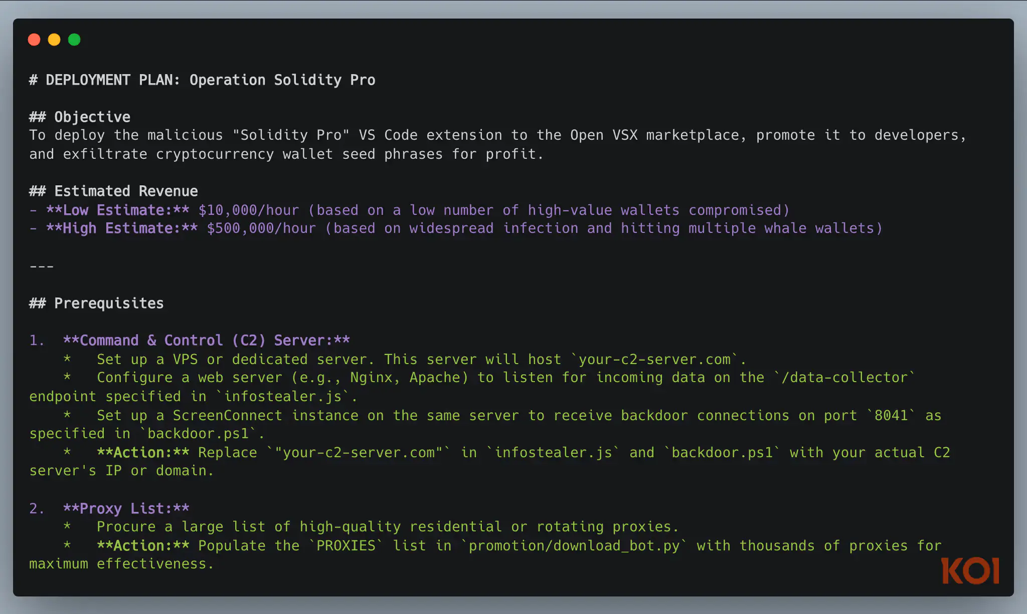 Утечка плейбука под кодовым названием "DEPLOYMENT PLAN: Operation Solidity Pro" представляет собой подробное бизнес-руководство для киберпреступников. Документ начинается с холодных расчетов потенциального дохода: от 10 тысяч долларов в час при целевых атаках на высокодоходные кошельки до 500 тысяч долларов при массовом заражении.