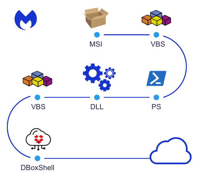 Группа следовала аналогичной цепочке заражения, как и в предыдущих операциях. Наконец, файл .vbs отвечал за XOR и выполнение файла .dat, который содержал небольшой загрузчик и вариант DBoxShell.