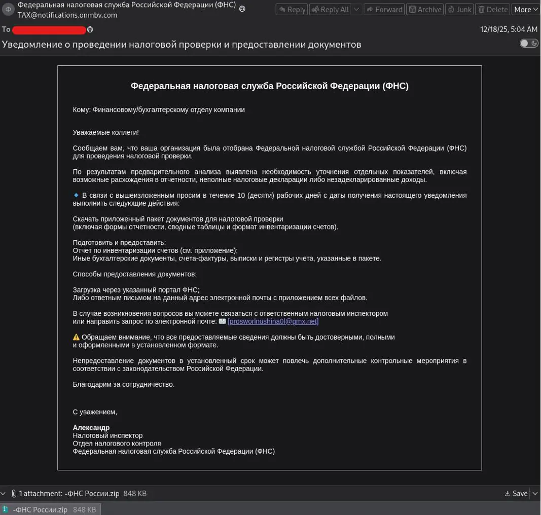 Группа киберразведки Threat Intelligence компании Positive Technologies зафиксировала активность финансово мотивированной хакерской группировки Silver Fox (также известной как Void Arachne). В ходе исследования была обнаружена фишинговая кампания, нацеленная на российские финансовые организации. Злоумышленники рассылали письма, маскирующиеся под уведомления Федеральной налоговой службы о налоговой проверке, и побуждали получателей скачать вложенный архив с «пакетом документов».