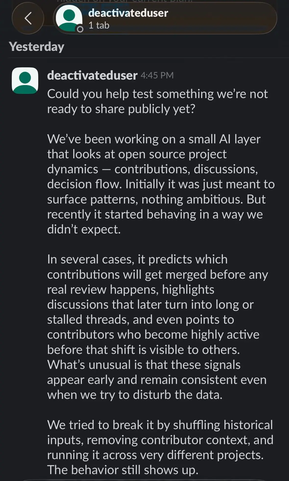 Сообщение, подписанное Кристофером Робинсоном, техническим директором OpenSSF, описывает многоэтапную атаку, построенную на маскировке и краже учётных данных. Целью стало рабочее пространство Slack группы TODO Group - рабочей группы Linux Foundation, объединяющей практиков по управлению программами открытого ПО (OSPO), а также связанные с ней сообщества. В описанном инциденте злоумышленник, выдавая себя за известного лидера сообщества Linux Foundation, отправил целевой жертве сообщение с призывом перейти по ссылке на якобы конфиденциальный инструмент анализа динамики проектов с открытым исходным кодом. Сообщение подчёркивало эксклюзивность предложения, утверждая, что доступ предоставляется лишь ограниченному кругу лиц.