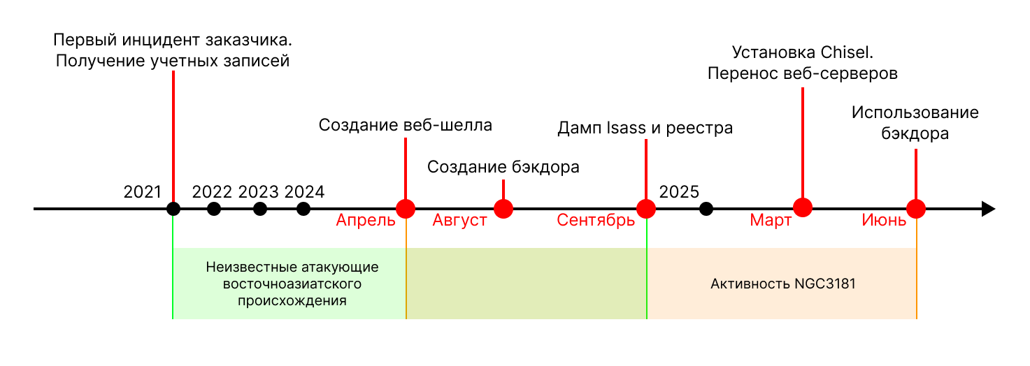 Исследование позволило частично восстановить хронологию атаки. Первичная компрометация инфраструктуры, вероятно, произошла еще в 2021 году, когда атакующие получили доступ к учетным записям сотрудников. Используя эти данные, они постепенно развивали атаку, а к 2024 году получили административный доступ к серверу TrueConf Server. Именно тогда был внедрен бэкдор в базу данных, обеспечивший группировке долгосрочное закрепление. В марте 2025 года злоумышленники также развернули туннелирующее ПО Chisel, замаскированное под легитимный модуль обновления TrueConf ("tc_update.exe"), для скрытого доступа к сети.
