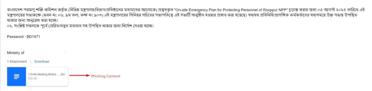 В киберпространстве Бангладеш зафиксирована масштабная фишинговая кампания, исходящая из взломанных электронных почтовых аккаунтов государственных и правоохранительных ведомств. Согласно техническому отчету, злоумышленники, получив доступ к легитимным учетным данным, рассылают мошеннические письма внутри правительственных коммуникаций, эксплуатируя доверие к официальной переписке.