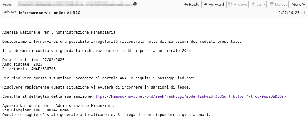 Атака началась с электронного письма, полученного 27 февраля 2026 года. Сообщение имитировало уведомление от итальянского налогового органа, ссылаясь на некие «нерегулярности» в декларации за 2025 год. Это классический претекст, рассчитанный на чувство тревоги и срочности у получателя - будь то частное лицо или сотрудник финансового отдела компании. Уже в деталях рассылки проявилась её двойственность: в теме письма фигурировала аббревиатура ANBSC (Национальное агентство по управлению имуществом, конфискованным у организованной преступности), в то время как в подвале сообщения был указан адрес другого ведомства - Агентства доходов. Такие несоответствия снижают формальную достоверность, но в потоке рабочей переписки могут остаться незамеченными, особенно если получатель сфокусирован на тревожном содержании.