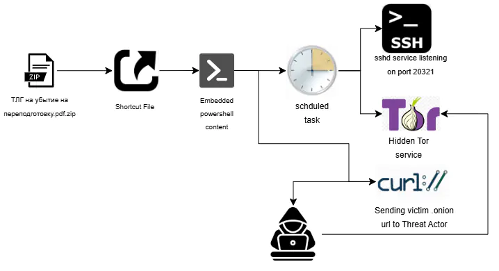 В октябре 2025 года специалисты Cyble Research and Intelligence Labs обнаружили целенаправленную кибератаку на оборонный сектор, в ходе которой злоумышленники распространяли вредоносный ZIP-архив, замаскированный под военный документ под названием «ТЛГ на убытие на переподготовку.pdf». Атака отличалась высокой технической сложностью и использованием передовых методов скрытности, включая комбинацию OpenSSH для Windows и кастомизированной скрытой службы Tor с обфускацией трафика через протокол obfs4.