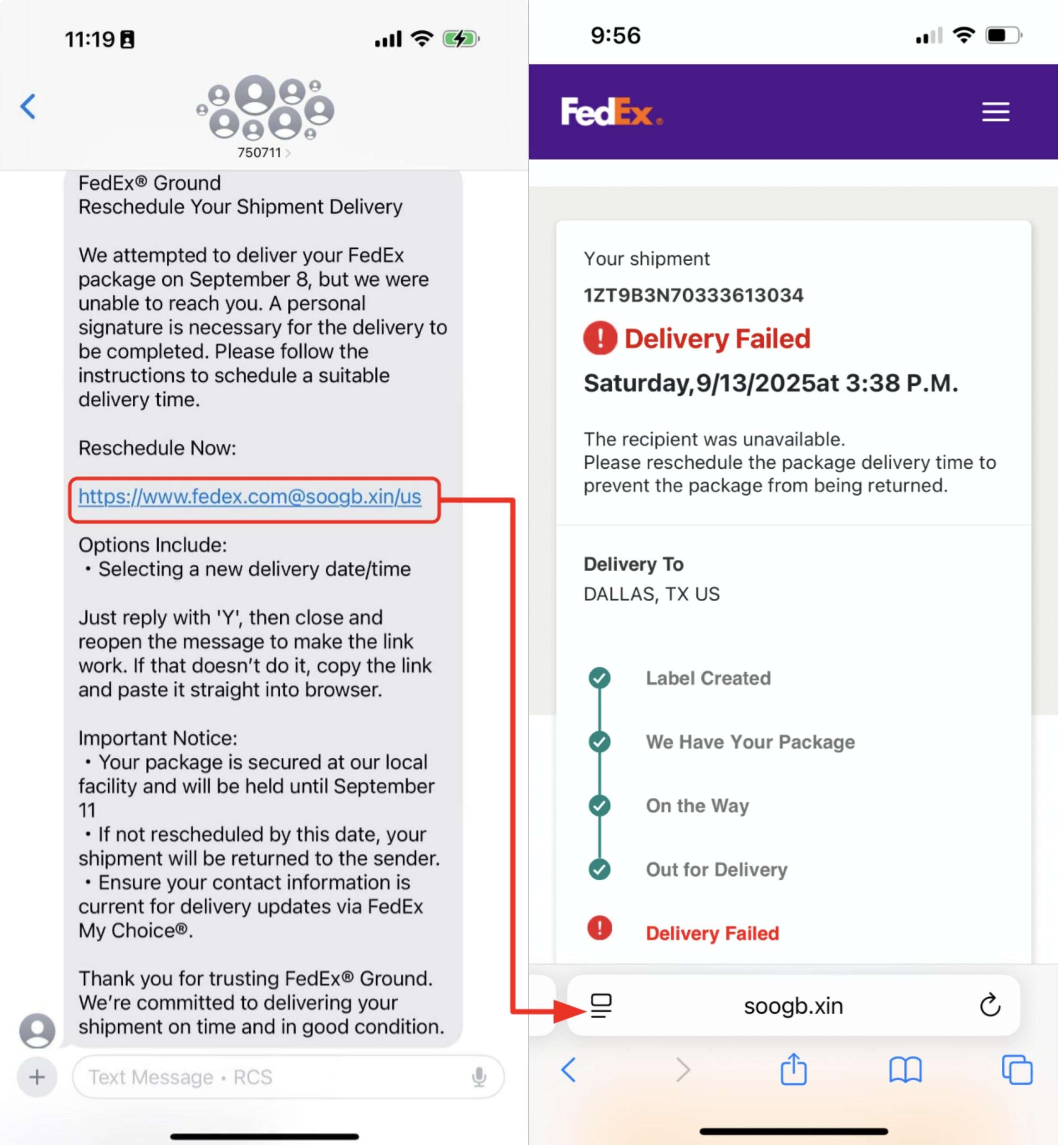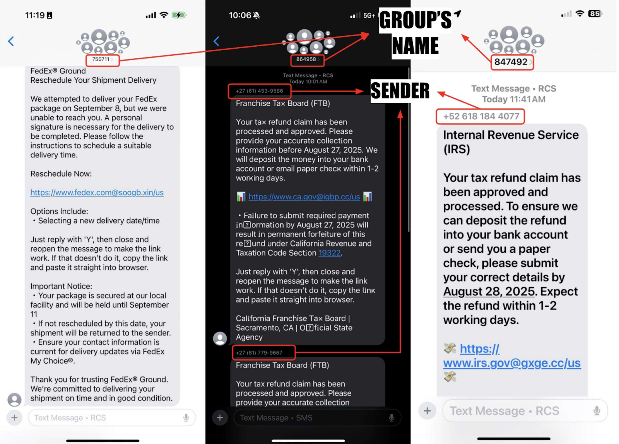 Параллельно с манипуляциями URL-адресами атаки включают групповые текстовые рассылки, где сообщения отправляются одновременно нескольким получателям под предлогом задержек доставки или срочных обновлений услуг. Получатели видят в групповой переписке свои номера телефонов и номера других участников, что создает ложное ощущение легитимности. Например, в одной из таких рассылок сообщалось о необходимости переназначить дату доставки посылки от FedEx, но при переходе по ссылке загружался троянец удаленного доступа.