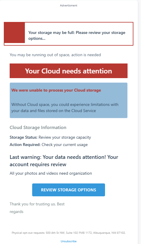 В течение последних двух месяцев зафиксирован значительный рост фишинговых атак, нацеленных на владельцев облачных учетных записей. Злоумышленники рассылают мошеннические письма на французском и английском языках, маскируя их под уведомления от служб поддержки облачных хранилищ. Основная тематика писем включает предупреждения о блокировке аккаунта, переполнении дискового пространства, риске потери данных, проблемах с оплатой и истечении срока действия платежных методов.