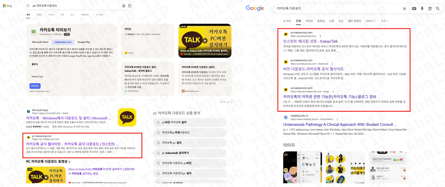 SEO-отравление - это метод атаки, при котором злоумышленники используют приемы поисковой оптимизации (SEO) для искусственного завышения позиций контролируемых ими вредоносных сайтов в результатах поиска по определенным ключевым запросам. Цель - заманить пользователей, ищущих официальное программное обеспечение или информацию, на тщательно сфабрикованный фейковый ресурс для последующего распространения вредоносных программ или кражи данных. В случае с KakaoTalk, при поиске настольной версии мессенджера, на первые позиции в Google и Bing выводился сайт "pc-kakaocorp[.]com", стилизованный под официальный, с использованием логотипов и персонажей бренда. Оттуда пользователи перенаправлялись для загрузки файлов "KakaoTalk_Setup_patched.RAR" или "KakaoTa2258.zip", содержащих вредоносную нагрузку.
