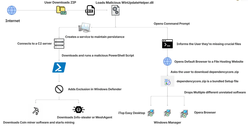 Атака начинается, когда пользователь скачивает и запускает исполняемый файл из архива. Этот файл, что важно, является легитимным и чистым. Однако он загружает вредоносную библиотеку WinUpdateHelper.dll, которая и выполняет основную работу. Пользователю отображается сообщение об ошибке - якобы не хватает критических зависимостей, - и его браузер перенаправляется на сторонний сайт для загрузки файла DependencyCore.zip. Установка этого пакета (например, программы iTop Easy Desktop) служит лишь отвлекающим манёвром, пока вредоносный код уже действует.