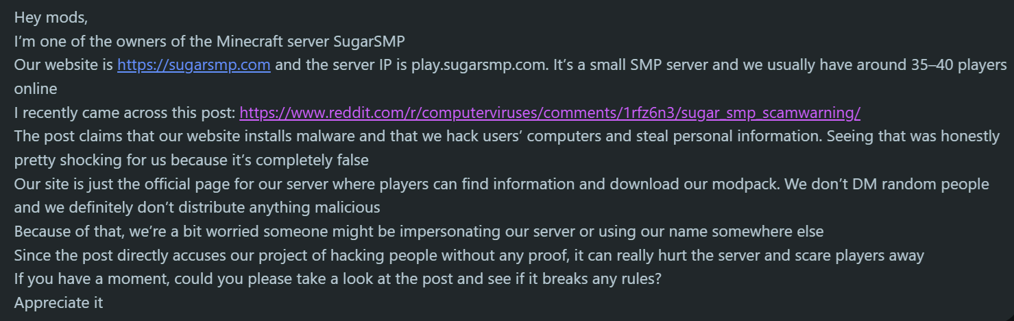 Подозрения переросли в целенаправленное расследование после того, как владелец SugarSMP, используя взломанный аккаунт разработчика модов, обратился к модераторам Reddit с требованием удалить пост, в котором пользователь RevolutionaryBug4262 предупреждал о мошенничестве. В своём обращении пользователь детально описал, как после установки модпака с сайта столкнулся с экраном-вымогателем, получил угрозы о публикации личных данных и требованием выкупа в 300 долларов. Злоумышленник, по словам жертвы, заявил о доступе к паролям из браузера, фотографиям из iCloud и полному контролю над ноутбуком. Этот инцидент побудил исследователей изучить архивные версии сайта через Wayback Machine, где им удалось найти и проанализировать исходный вредоносный модпак SugarSMP-1.0.zip.