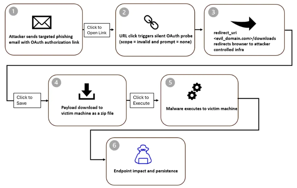 Атака начинается с того, что злоумышленник создает в контролируемом им облачном тенанте (арендованном экземпляре) приложение, использующее OAuth. В настройках этого приложения указывается Redirect URI (URI перенаправления), ведущий на вредоносный домен. После этого жертвам рассылаются фишинговые письма с призывом перейти по ссылке, которая имитирует запрос на авторизацию. Ключевой особенностью атаки является умышленная подстановка в URL параметров, гарантирующих сбой аутентификации, например, невалидной области действия (scope) или директивы "prompt=none", требующей «тихого» (без интерфейса) входа. Когда провайдер идентификации обрабатывает такой запрос, он сталкивается с ошибкой, и, согласно стандарту OAuth, перенаправляет пользователя на указанный в приложении URI, то есть на страницу злоумышленника. При этом сам токен доступа не передается, но цель - доставить жертву на вредоносный ресурс - достигается.