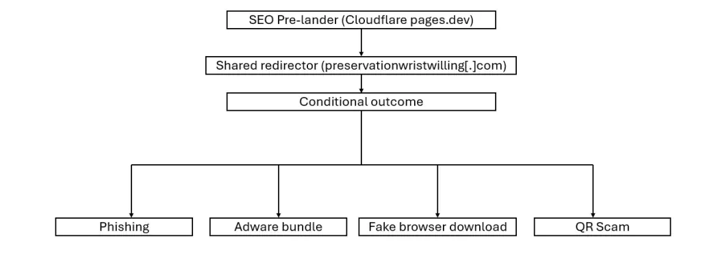 После клика браузер пользователя перенаправляется не напрямую на финальную вредоносную страницу, а на центральный редиректор. Анализ показал использование общего конечного пункта, такого как "preservationwristwilling[.]com", который функционирует как полноценная система распределения трафика (Traffic Distribution System, TDS).