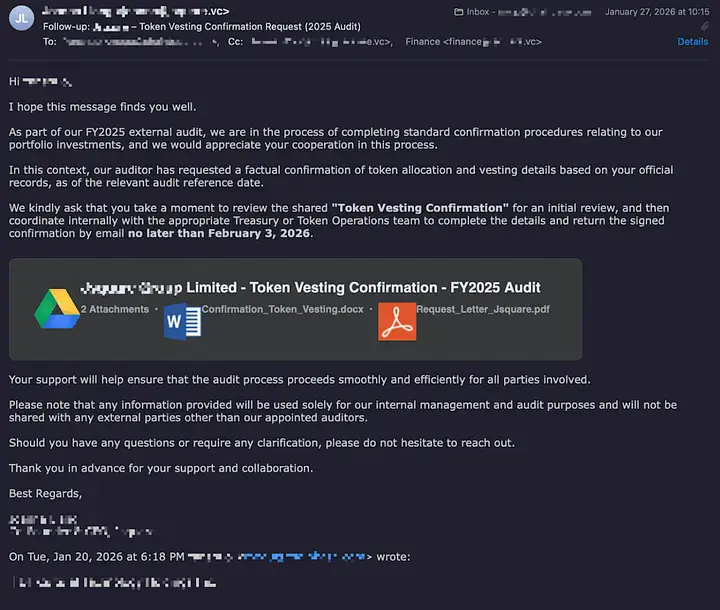 Эксперты компании Chainbase совместно с аналитиками SlowMist исследовали целевую фишинговую кампанию, направленную на пользователей операционной системы macOS. Злоумышленники, маскируясь под сотрудников аудиторских служб, рассылают письма с темами вроде «Подтверждение юридического названия компании» или «Подтверждение вестинга токенов - крайний срок подачи». Вложение, замаскированное под документ Word (.docx), на самом деле является исполняемым скриптом AppleScript (.scpt), что открывает многоэтапную цепочку заражения.