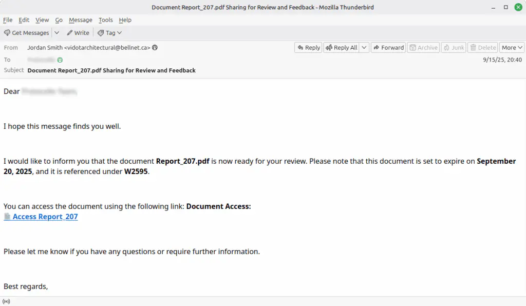 В последние дни была зафиксирована новая вредоносная кампания, маскирующаяся под систему обмена документами. Она повторяет схему, ранее наблюдавшуюся при распространении поддельных обновлений для электронной подписи, однако на этот раз сообщения составлены на английском языке и используется другой инструмент. Атака направлена на установку легального программного обеспечения для удалённого управления, которое затем применяется в злонамеренных целях.