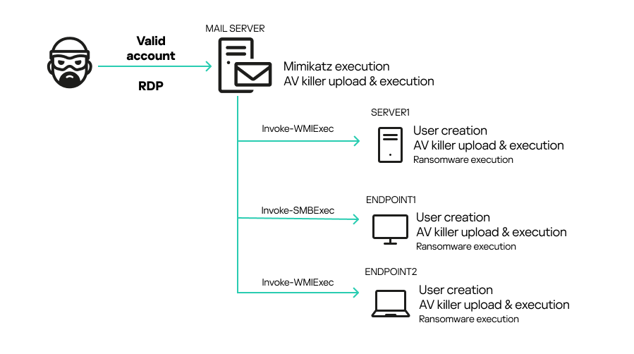 Атакующие получили доступ к корпоративной сети через уязвимый SMTP-сервер, используя действующие учетные данные RDP. После проникновения они применили Mimikatz для извлечения NTLM-хэшей других пользователей, что позволило им перемещаться по сети с помощью методов Pass-the-Hash и инструментов Invoke-WMIExec.ps1 и Invoke-SMBExec.ps1.