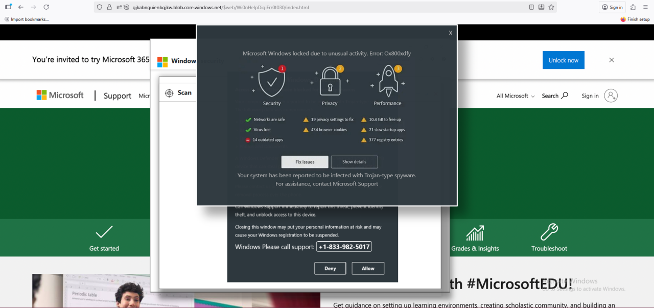 Финальная страница с фальшивым предупреждением размещалась на поддомене blob.core.windows[.]net, что может создавать у пользователей ложное впечатление легитимности благодаря ассоциации с облачной инфраструктурой Microsoft. При этом сам вредоносный контент имитировал сообщения технической поддержки или системные ошибки, побуждая пользователей к активным действиям.