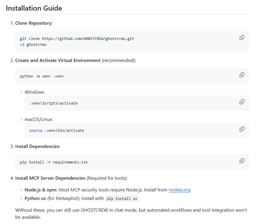 Ядро системы использует большие языковые модели (Large Language Models, LLMs), протокол MCP (Model Context Protocol) и технологию RAG (Retrieval-Augmented Generation, генерация с подкреплением поиском). Интеграция с MCP позволяет специалистам по безопасности управлять такими стандартными утилитами, как Metasploit, Nmap и SQLMap, напрямую из чат-интерфейса. Таким образом, GHOSTCREW объединяет разрозненный ландшафт инструментов в единую плоскость управления.