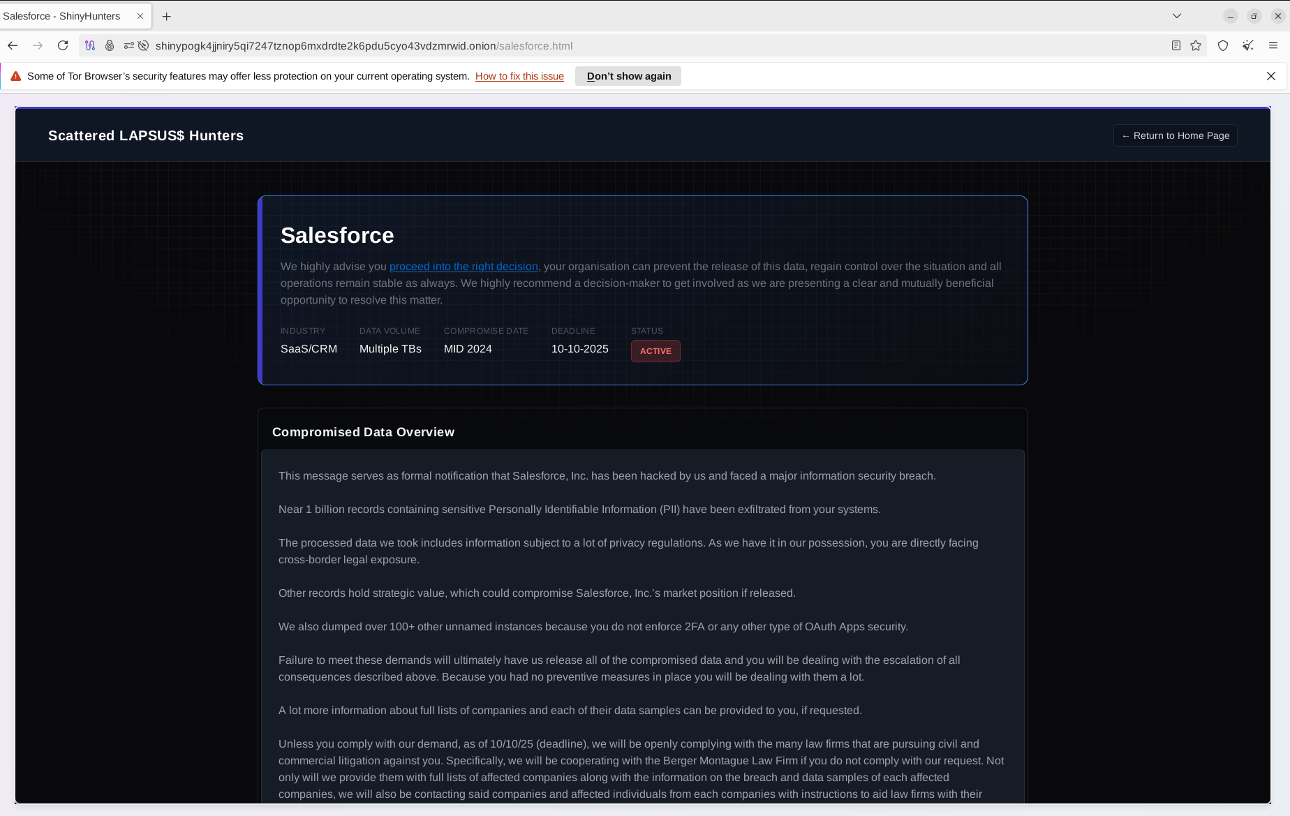 Злоумышленники заявили, что пытались связаться с Salesforce ранее, но не смогли договориться об условиях предотвращения раскрытия данных. Подобно тактике других групп вымогателей, они пригрозили сообщить о доказательствах утечки данных регуляторам, что может привести к "обвинениям в уголовной халатности" против компании.
