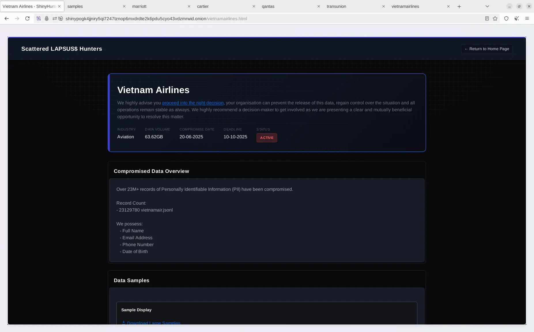 Киберпреступники предоставили доказательства успешных утечек данных, затрагивающих авиакомпании, включая Air France и KLM. Утечка PII-данных в этих инцидентах может быть особенно разрушительной, особенно в Европейском Союзе, где правила защиты данных, такие как GDPR, предусматривают строгие штрафы за нарушения, связанные с личной информацией.