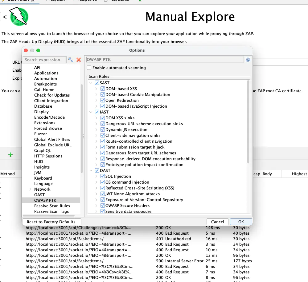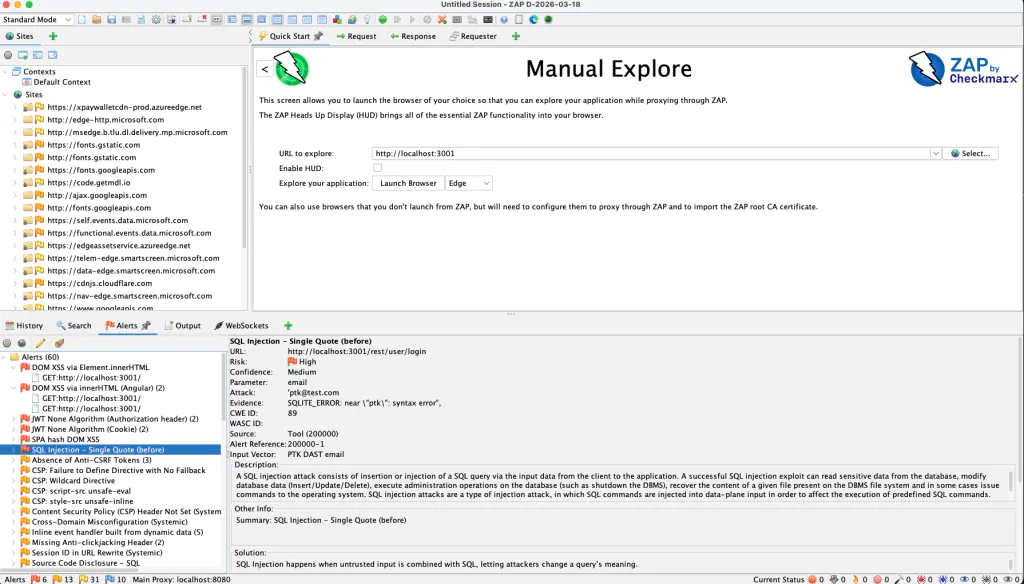 На практике это означает, что, к примеру, интерактивный анализатор IAST теперь может пометить как опасную операцию с данными, достигшими чувствительной функции DOM во время исполнения, даже если ответ сервера выглядит абсолютно нормальным для прокси. В свою очередь, статический анализатор SAST проверяет реальные JavaScript-бандлы, которые выполняет браузер, выявляя небезопасное использование innerHTML или опасные сторонние скрипты, пропускаемые стандартным прокси-сканированием. Для тестирования новой функциональности достаточно установить или обновить дополнение OWASP PTK через встроенный маркетплейс ZAP, настроить движки в разделе "Tools - Options - OWASP PTK" и запустить браузер через Quick Start, указав целевой URL. После навигации по приложению в аутентифицированном состоянии можно начать сканирование вручную через иконку расширения PTK в браузере, а результаты появятся во вкладке Alerts ZAP вместе с остальными находками.