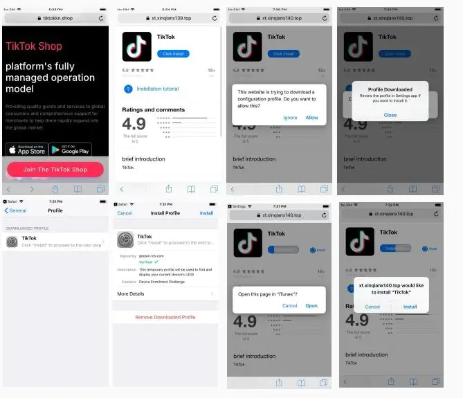 Особое внимание уделяется доменам, которые визуально похожи на официальные адреса TikTok Shop, но используют дешёвые зоны (.top, .shop, .icu). На данный момент обнаружено более 10 000 таких сайтов, включая поддельные версии TikTok Wholesale и TikTok Mall.