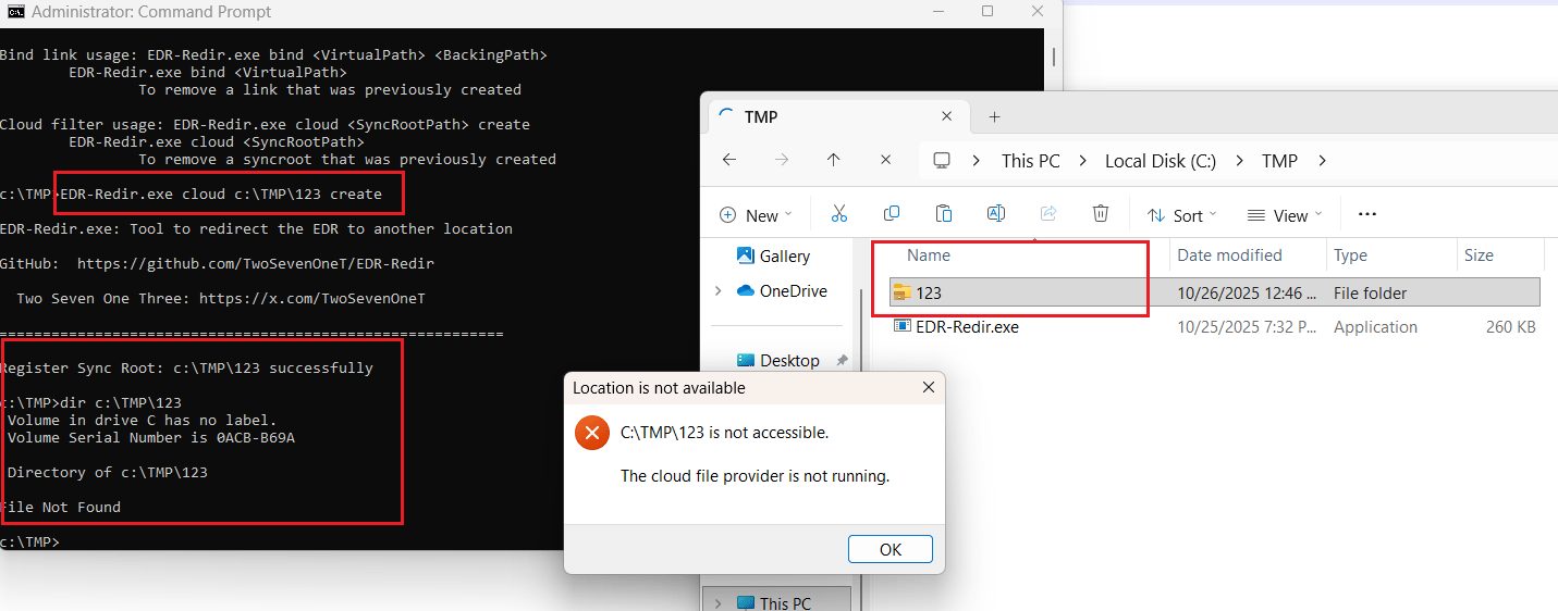 Тестирование против Elastic Defend продемонстрировало успешное перенаправление папки исполняемых файлов EDR в путь, контролируемый атакующим. Аналогично эксперименты с Sophos Intercept X показали успешное перенаправление папок, позволяющее полный контроль над рабочей директорией EDR. Для устойчивых систем, таких как Защитник Windows, исследователи применили Windows Cloud Filter API (CFAPI) через драйвер cldflt.sys. Этот подход включает регистрацию папки корня синхронизации с минимальными политиками, эффективно повреждая целевую папку и предотвращая доступ EDR к основным файлам.