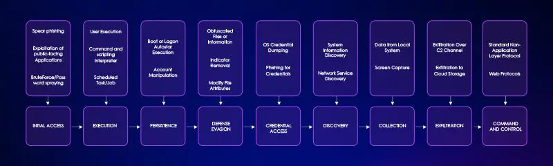 Сбор конфиденциальных данных включает кражу учетных записей (T1003), перехват сетевого трафика (T1040) и даже снимки экрана (T1113). Передача данных осуществляется через командные серверы (T1041) или облачные сервисы (T1567). Для управления зараженными системами применяются веб-протоколы (T1071.001) и прокси-серверы.