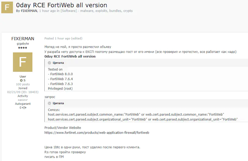 6 ноября 2025 года эксперты Rapid7 Labs сообщили о публикации на популярном хакерском форуме объявления о продаже предполагаемого эксплойта для уязвимости нулевого дня в FortiWeb. Пока не установлено, связан ли этот инцидент с текущей уязвимостью.