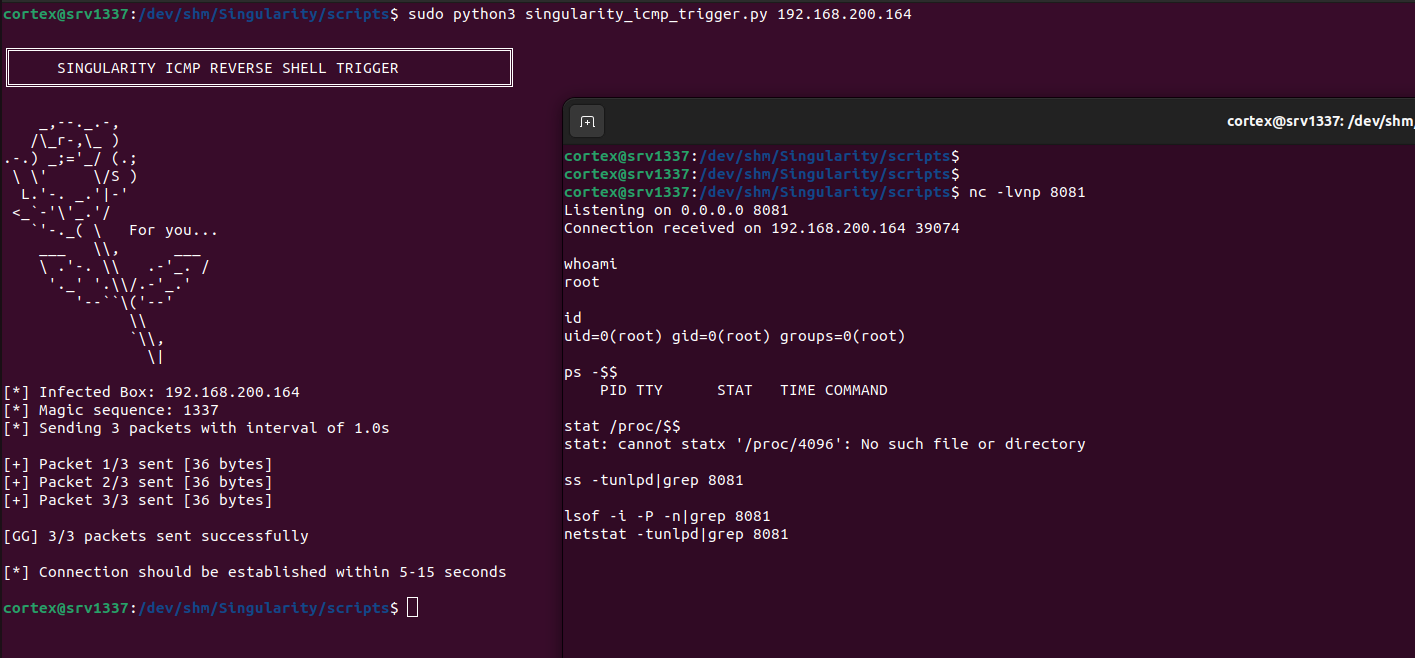 Однако сокрытие логов - лишь одна грань возможностей этого руткита. После загрузки модуль делает себя невидимым для системы и предотвращает свою выгрузку без перезагрузки. Он полностью скрывает связанные процессы от утилит вроде ps, top и htop, маскирует файлы и сетевые соединения, а также перехватывает трафик на выбранном порту. Для удалённого доступа реализована обратная оболочка, активируемая по ICMP-пакетам, что обеспечивает скрытый сеанс с правами root.