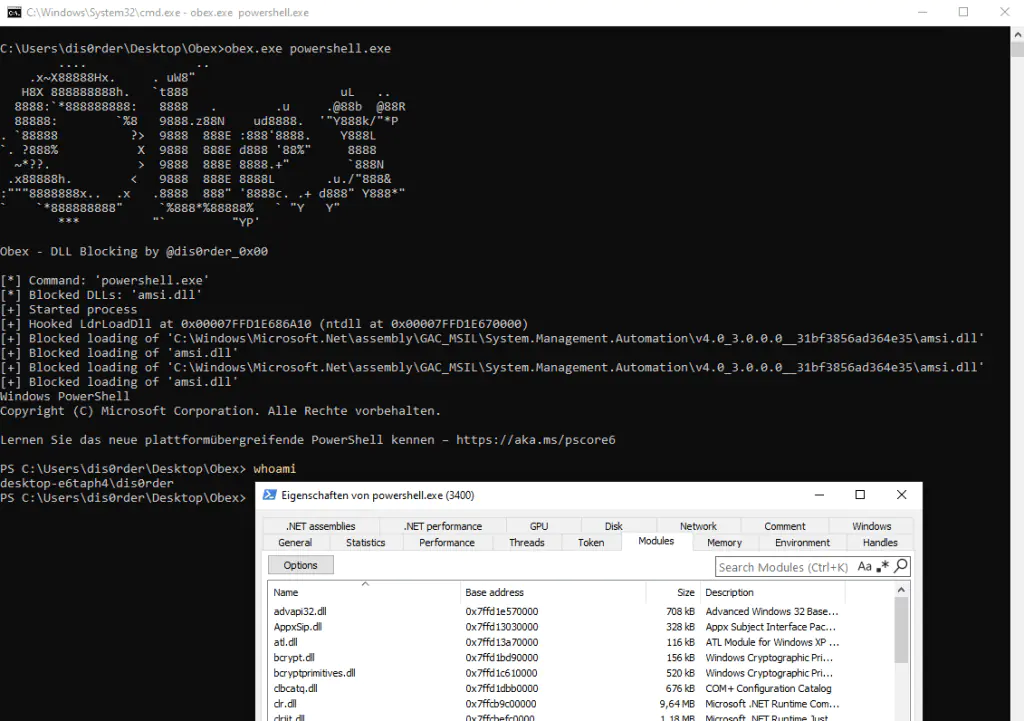 В демонстрации Obex запускает PowerShell, гарантируя, что amsi.dll никогда не загружается в адресное пространство процесса, что подчеркивает практический потенциал обхода внутрипроцессной инспекции. При вызове Obex анализирует аргументы командной строки для идентификации целевого исполняемого файла и дополнительного списка имен DLL для блокировки. Если список не предоставлен, инструмент по умолчанию предотвращает загрузку библиотеки интерфейса антивирусного сканирования в новый процесс.