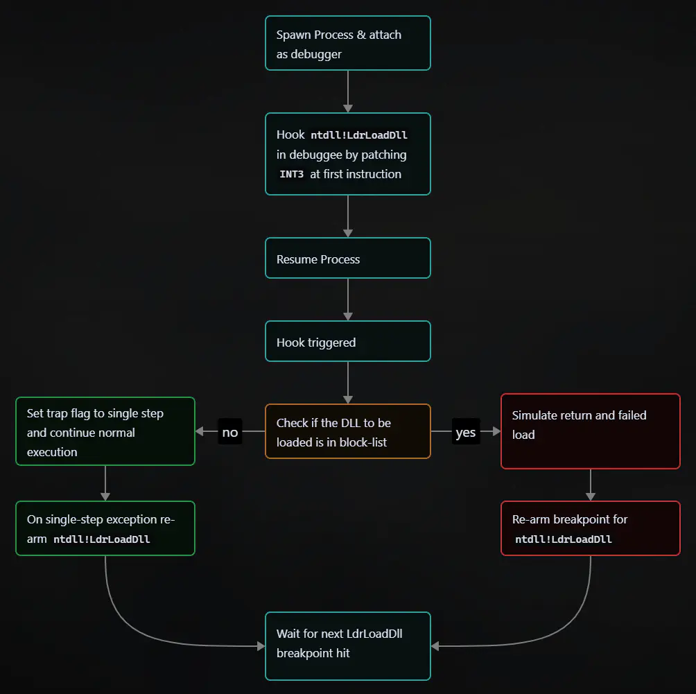 После этого Obex создает дочерний процесс в состоянии отладки, что позволяет перехватывать уведомления о загрузке модулей непосредственно во время инициализации процесса. Когда API отладки сообщает о предстоящей загрузке модуля - будь то зависимость при запуске или динамический вызов LoadLibrary - Obex сравнивает имя DLL без учета регистра со своим списком блокировки. При совпадении инструмент подавляет запрос на загрузку, в результате чего модуль остается отсутствовать в адресном пространстве процесса. Дочерний процесс продолжает выполнение без заблокированных библиотек, а Obex регистрирует или сообщает о заблокированных событиях для видимости оператора.