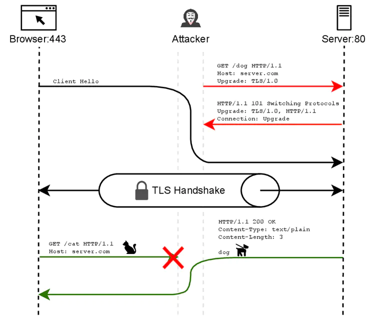 Главная особенность Opossum заключается в его способности эксплуатировать различия между двумя режимами работы TLS: "неявным" (implicit), когда безопасное соединение устанавливается сразу на выделенном порту (например, HTTPS на порту 443), и "оппортунистическим" (opportunistic), когда соединение начинается в незашифрованном виде, а затем повышается до TLS с помощью специальных заголовков. Злоумышленник, перехватывая трафик, перенаправляет запрос клиента с защищенного порта на незащищенный, инициируя обмен данными в незашифрованном виде, а затем подменяет содержимое TLS-сессии.