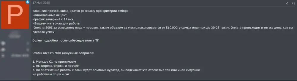 Интересно, что русскоязычные хакерские группировки, связанные с Scattered Spider, активно нанимают англоговорящих социальных инженеров для атак на западные компании. На киберпреступных форумах публикуются вакансии с требованиями к кандидатам: отсутствие акцента, уровень английского C1 и выше, а также готовность работать в вечерние смены (по московскому времени). Оплата за такую работу может достигать $25 000 в месяц, что свидетельствует о высоком уровне профессионализации киберпреступных группировок.