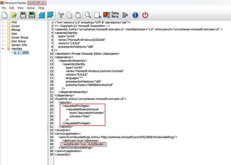 Проблема обнаружена в утилите "eudcedit.exe", расположенной в каталоге "C:\Windows\System32". Этот инструмент, предназначенный для редактирования пользовательских символов (EUDC), содержит в манифесте две критически опасные настройки.