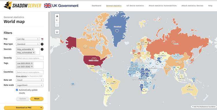 Согласно данным фонда Shadowserver, на 29 сентября 2025 года было обнаружено более 48 800 публично доступных IP-адресов, работающих на уязвимых версиях межсетевых экранов. Наибольшее количество незащищенных устройств зафиксировано в Соединенных Штатах, за которыми следуют Германия (более 5200), Бразилия (более 4500), Индия (более 3800) и Великобритания (более 3300). Организация начала публиковать ежедневные отчеты о уязвимых экземплярах ASA/FTD в своей системе мониторинга уязвимых HTTP-сервисов.