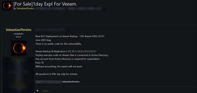 Хотя не было зафиксировано случаев публичной эксплуатации или появления готового к использованию PoC, выставление такого инструмента на продажу по указанной цене свидетельствует о значительном спросе и потенциальной ценности среди субъектов угроз. Специалистам в области безопасности настоятельно рекомендуется рассматривать все развертывания Veeam 12.x как потенциально находящиеся под угрозой до появления официального подтверждения или информации об исправлении.