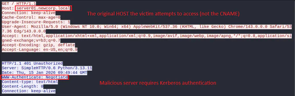 Ключевая проблема в том, что клиент Windows, следуя этому поддельному CNAME, формирует запрос на получение билета службы-получателя (Ticket Granting Service, TGS) для имени субъекта-службы (Service Principal Name, SPN), указанного в CNAME, а не для исходного целевого сервиса. Это позволяет злоумышленнику заставить жертву запросить Kerberos-билет для системы под его контролем. Впоследствии этот билет можно передать (срелеить) на настоящий целевой сервис, успешно выдав себя за жертву. Таким образом, атака открывает путь для перемещения внутри сети (lateral movement) и повышения привилегий даже в средах, где полностью отключена устаревшая аутентификация NTLM.