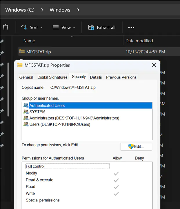 Суть уязвимости кроется в некорректных разрешениях файловой системы. Анализ с помощью инструментов контроля доступа выявил, что любой аутентифицированный пользователь в системе обладает правами на запись и выполнение для MFGSTAT.zip. Проверка списков управления доступом (ACL) через проводник Windows подтвердила: стандартные учетные записи пользователей действительно могут модифицировать этот объект. Это создает серьезную угрозу, поскольку правила AppLocker по умолчанию разрешают запуск любых исполняемых файлов из каталога C:\Windows. Таким образом, злонамеренные акторы получают возможность использовать уязвимый ZIP-архив как платформу для обхода политик белого списка приложений.