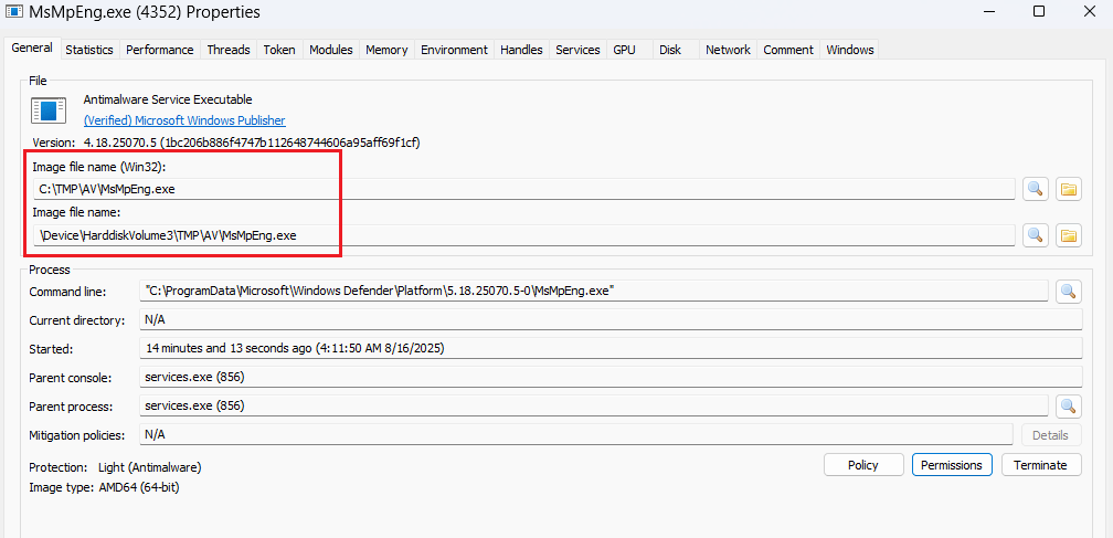 Создав симлинк с наивысшим номером версии, атакующие могут перенаправить Defender в папку, полностью находящуюся под их контролем. Например, ссылка из C:\ProgramData\Microsoft\Windows Defender\Platform\5.18.25070.5-0 в C:\TMP\AV заставляет антивирус выполнять код из управляемого злоумышленником каталога. Это предоставляет нарушителям полные права на чтение и запись для двоичных файлов защитного решения.